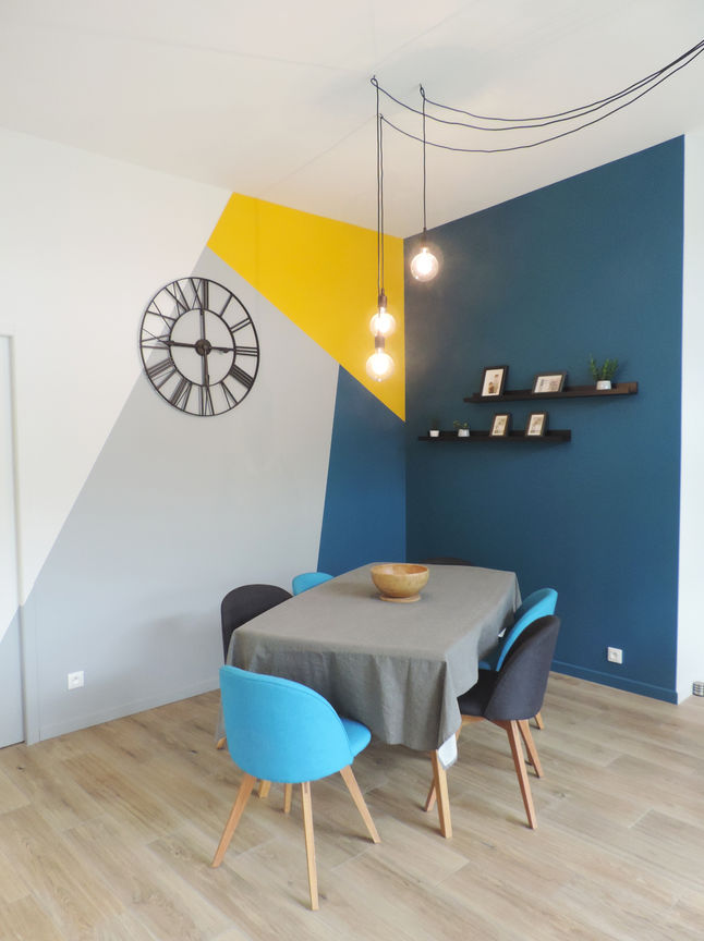 La hauteur sous plafond, dans le séjour, a été mise en valeur grâce à un mur graphique en couleurs et des suspensions lumineuses modulables. Un effet de matière en crédence dans la cuisine dynamise l'ensemble.
