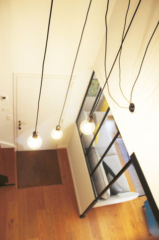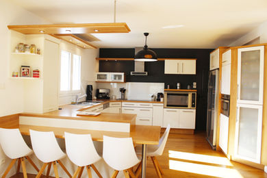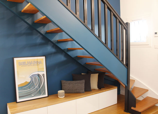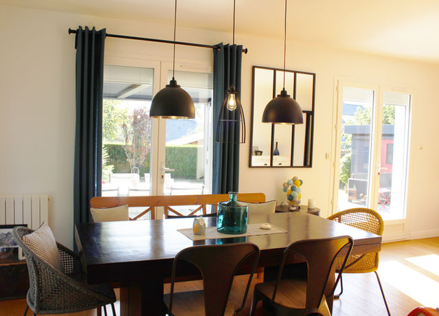 Dans ce projet de rénovation, nous avons transformé l'ambiance de l'entrée et de la pièce de vie. L'escalier, auparavant blanc a été relooké en bleu et noir, apportant une touche plus moderne. Nous avons également ajouté une banquette de rangement sous l'escalier et ouvert l'espace sur le salon grâce à une verrière. L'espace salon-séjour s'est paré d'un style plutôt industriel avec cette belle cheminée suspendue et ce babyfoot. La cuisine bien qu'inchangée, a été relookée pour s'harmoniser parfaitement avec l'ensemble de la pièce.
